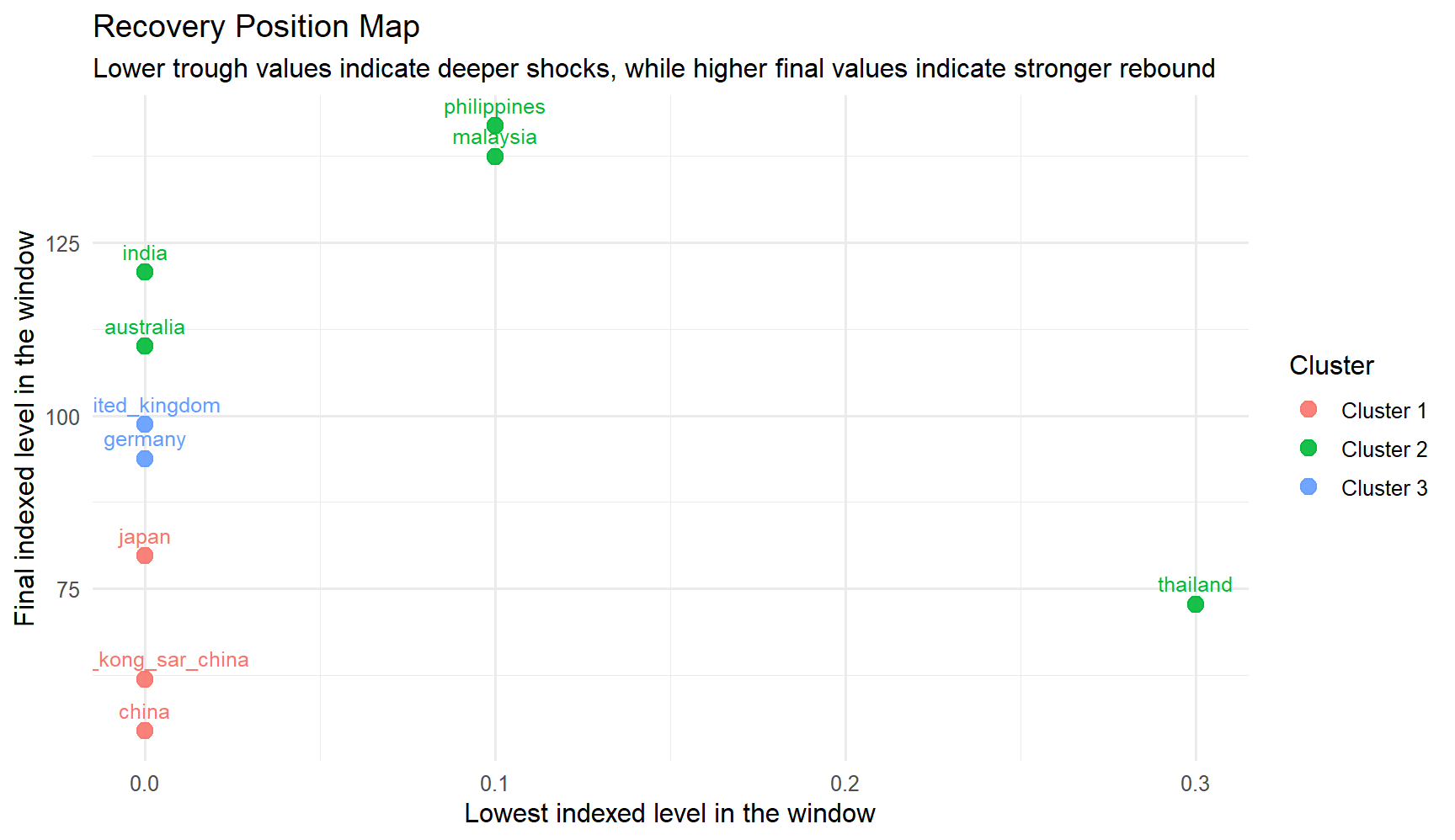 ggplot( cluster_solution$series_features,aes(x = trough_index, y = end_index, color = cluster, label = series)) +geom_point(size =3.2, alpha =0.9) +geom_text(vjust =-0.8, size =3.3, show.legend =FALSE) +labs(title ="Recovery Position Map",subtitle ="Lower trough values indicate deeper shocks, while higher final values indicate stronger rebound",x ="Lowest indexed level in the window",y ="Final indexed level in the window",color ="Cluster" ) +theme_minimal(base_size =12)