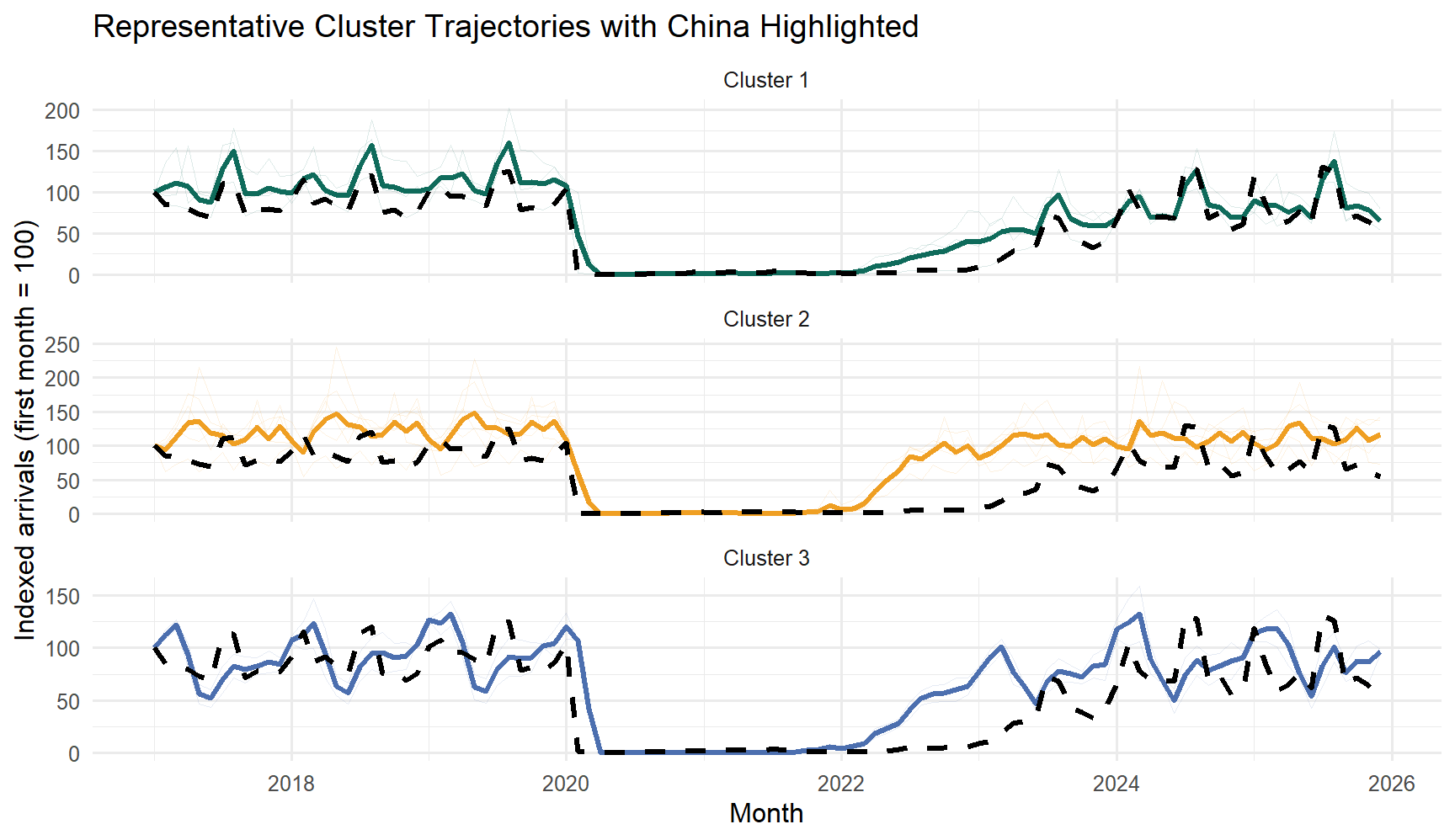 china_line <-data.frame(date = country_indexed$date,indexed_value = country_indexed[[china_series]],series = china_series)ggplot(cluster_solution$plot_data, aes(x = date, y = value, color = cluster, group =interaction(series, type))) +geom_line(data =subset(cluster_solution$plot_data, type =="Series"),alpha =0.14,linewidth =0.35 ) +geom_line(data =subset(cluster_solution$plot_data, type =="Cluster mean"),linewidth =1.15 ) +geom_line(data = china_line,aes(x = date, y = indexed_value),inherit.aes =FALSE,color ="black",linewidth =1.2,linetype ="dashed" ) +scale_color_manual(values =c("Cluster 1"="#0f6b5b", "Cluster 2"="#ef9f23", "Cluster 3"="#4c6faf")) +labs(title ="Representative Cluster Trajectories with China Highlighted",x ="Month",y ="Indexed arrivals (first month = 100)",color ="Cluster" ) +facet_wrap(~cluster, ncol =1, scales ="free_y") +theme_minimal(base_size =12) +theme(legend.position ="none")